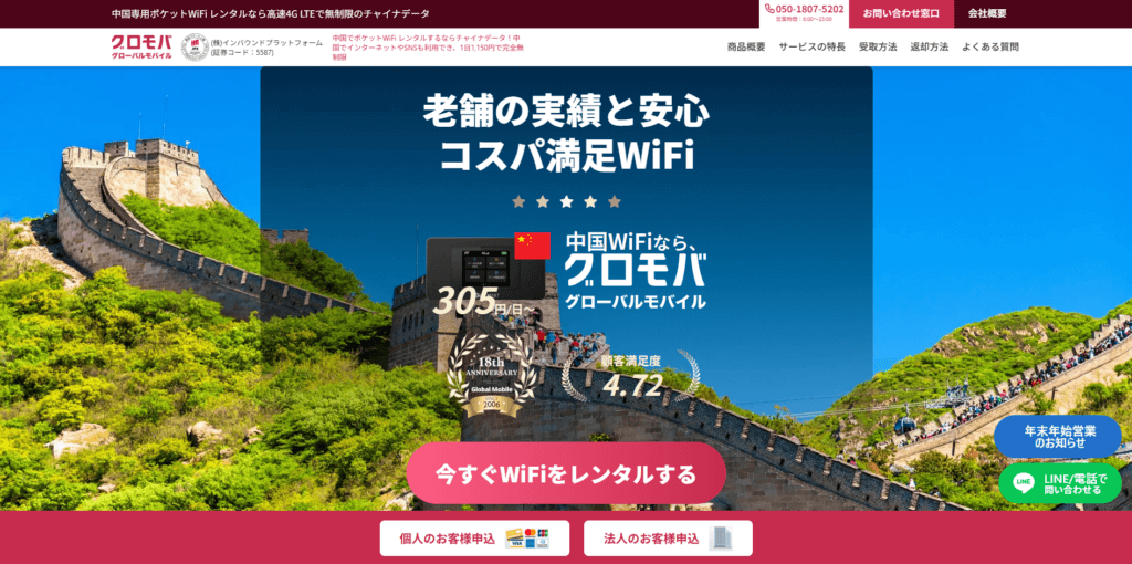 グローバルWiFiは、海外WiFiレンタル業界で利用者数No.1を誇る老舗サービスです。中国向けには「特別回線プラン」を提供しており、VPN設定不要でLINEやGoogle、YouTubeなどが利用可能となっています。