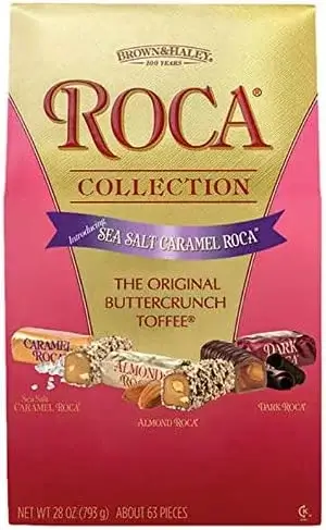 キャラメルロカは、アメリカの老舗菓子メーカー「Brown & Haley」の人気商品です。サクサクのバタークランチをキャラメルでコーティングし、アーモンドをまぶした贅沢なお菓子です。